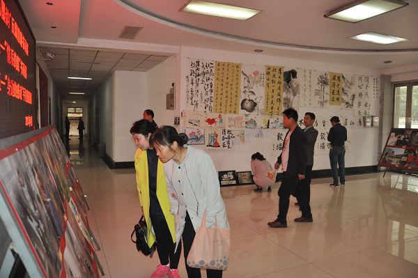 为营造风清气正的干事创业氛围,展示广大干部职工的艺术水平,4月19日,河南能源化工集团鹤煤公司三矿工会、纪检科联合在矿办公楼大厅举办了身边的感动暨反腐倡廉书画摄影展,对征集来的100余副书画、摄影作品进行了展出。图为该矿职工在观看书画、摄影展。