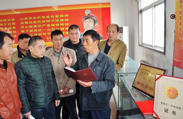 10月19日,安徽淮北矿业公司朱仙庄矿共产党员、“全国五一劳动奖章”获得者、群安讲堂负责人----倪龙(前右一)正在利用课间向职工学校学员宣传十九大报告。作为“全国五一劳动奖章”获得者、群安讲堂负责人在观看十九大开幕会直播后主动当起了十九大报告的宣传员,他把报告内容抄写在笔记本上,利用课间向职工宣传报告,并积极征求职工对群众安全和职工教育工作的意见和要求。