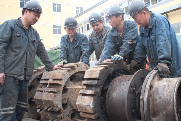 图为运搬工区维修班班长芦顺利(右二)在工作现场为大家传授维修破碎机的“技术经”。