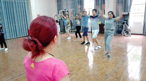 训练中,大家按照教练的指导示范,对动作分解、队形编排等内容,进行由易到难的反复练习。为了保证进度,大家严格遵守团队纪律,每天集训时间都不低于两个半小时。大家体能不同,基础各异,常常相互帮助,相互鼓励,努力做到流畅自然、整齐划一,争取在月底的比赛中,赛出风格,赛出成绩。