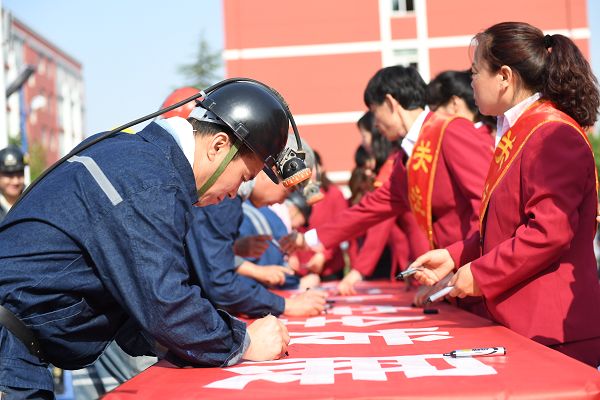 宣誓人员在印有“生命至上 安全发展”主题的横幅上签名。