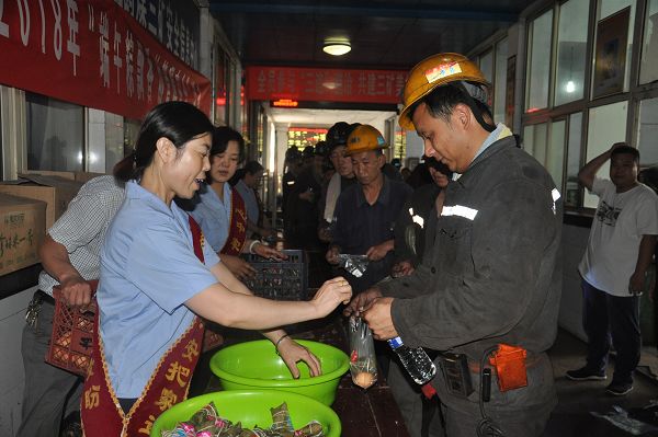 这是6月14日下午14时40分,河南能源集团鹤煤公司三矿工会在副井口开展“端午粽飘香,协管嘱安全”慰问活动的一个动人场景。