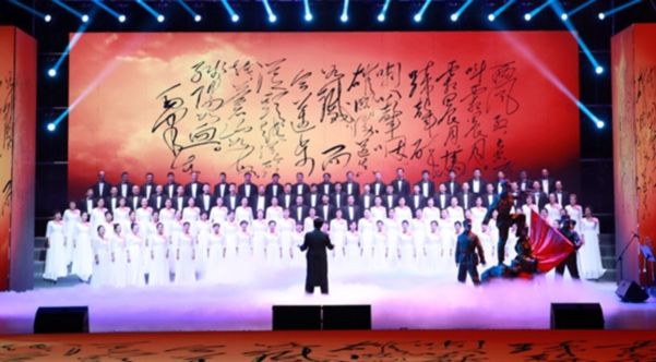 在《娄山关》曲目合唱中,一架钢琴作为整首歌曲的特别伴奏是本场演出的一大特色,在毛泽东《《忆秦娥·娄山关》手迹背景视频衬托下,合唱团时而歌声柔美、时而铿锵有力,时而低沉慢吟、时而激情迸发,仿佛时光轮转把现场观众带回到马蹄声碎、狼烟四起的战争年代,歌声以景入情,情中有景,舞台前几名红军战士手拿钢枪,挥舞旗帜,使人感受到红军铁血长征中征战娄山关的激烈场景,寓意陕煤儿女将以坚定的理想信念,在转型发展的雄关漫道中,砥砺奋进、励志图强的坚定信心和决心。