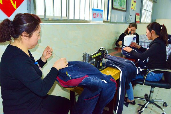 10月30日, 5名家属安全协管员坐在洗衣房中间的3台缝纫机前开始为矿工缝补工作服。两张巨大的工作台上放满了叠得整整齐齐已经缝好的和待补的工作服,一个盒子里面装满了黑色的扣子。此时,一位准备下井的员工急急忙忙来到缝补台,说刚发现自己衣服的扣子不知啥时间丢了,家协员王锦丽急忙在工作台取来扣子,站在这名职工的面前认真的缝了起来,缝完后用牙齿将线绳咬断,又用手拽拽这位素不相识员工衣服上的褶皱,好像是为自己的丈夫上班前整理衣帽一样,举止之间渗透着温柔的爱。 这时家协女工主任马爱琴告诉笔者:“多年来,我们坚持每周二、周四给矿工缝补衣服,而且坚持夏送清凉,冬送温暖,节日送祝福,四季送关爱的服务宗旨。夏天为井下职工送去清凉的绿豆汤、甘甜的西瓜;冬天送去热乎乎姜汤和可口的家常饭;平时,送去亲手缝制的平安鞋垫、棉靴袜和安全红腰带等慰问品,叮嘱矿工兄弟们要时刻牢记安全,保持清醒头脑,坚决杜绝‘三违’,以良好的精神状态投入到工作当中去。”