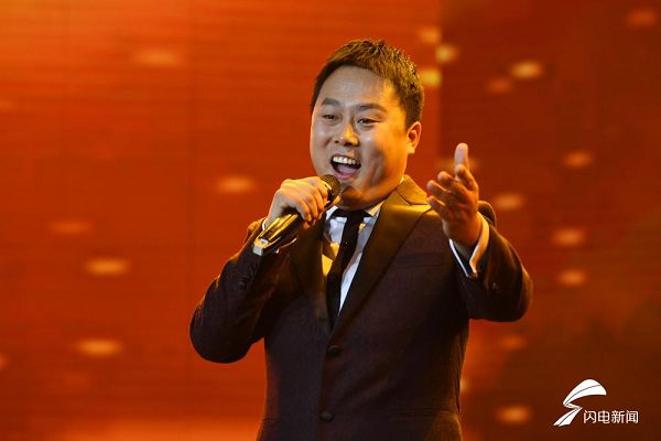 山东广播电视台主持人汪洋在舞台上激情演唱《春风十里》。