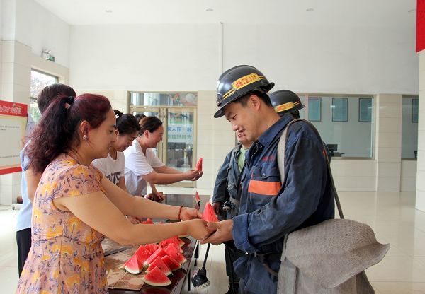 由女职工、“爱心帮办”志愿者、家属协管员组成的“夏送清凉”队伍,每天将熬好的绿豆汤或绿茶等饮品送到井口供职工选择,并交替为一线职工送西瓜、雪糕等,让职工清凉解暑。同时,队员们编排安全文艺节目进行演出,送上安全叮嘱和祝福,活动将持续到9月份,全力营造一线职工下井前清凉、轻松的氛围。