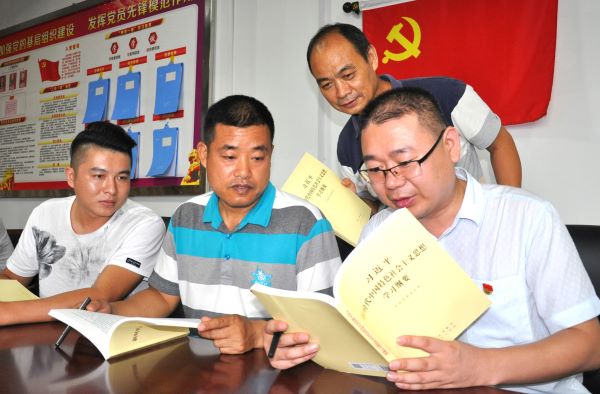 7月25日,淮北矿业集团朱仙庄矿安监处党支部书记(右一)杨泽全正在与党员交流学习体会。该处党支部在开展“不忘初心、牢记使命”主题教育中要求全体党员认真读原著、学原文、悟原理,以新印发的《习近平新时代中国特色社会主义思想学习纲要》《习近平关于“不忘初心、牢记使命”重要论述选编》为主要学习切入点,编制学习计划,组织自学和集中学习,利用党员活动日组织党员开展学习心得交流,结合工作实际畅谈学习体会,切实做到用习近平新时代中国特色社会主义思想武装头脑、指导实践、推动工作。