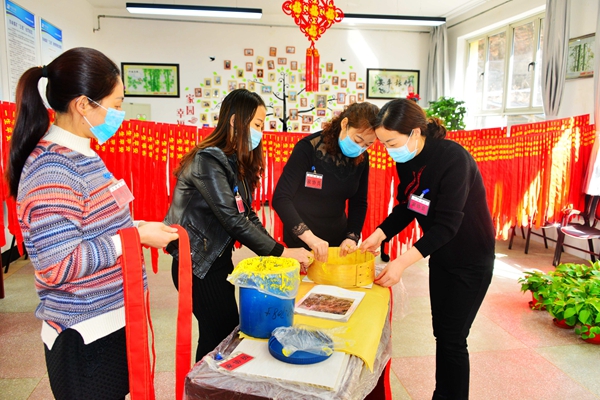 3月5日,华亭煤业集团公司东峡煤矿286名女工加班加点制作红腰带,为赶在“三八”节前给一线职工送平安与祝福,希望每一位工友都能平平安安健健康康,祝愿矿区和谐美好。图为家属协管员正在给红腰带上印制“一生平安”字。