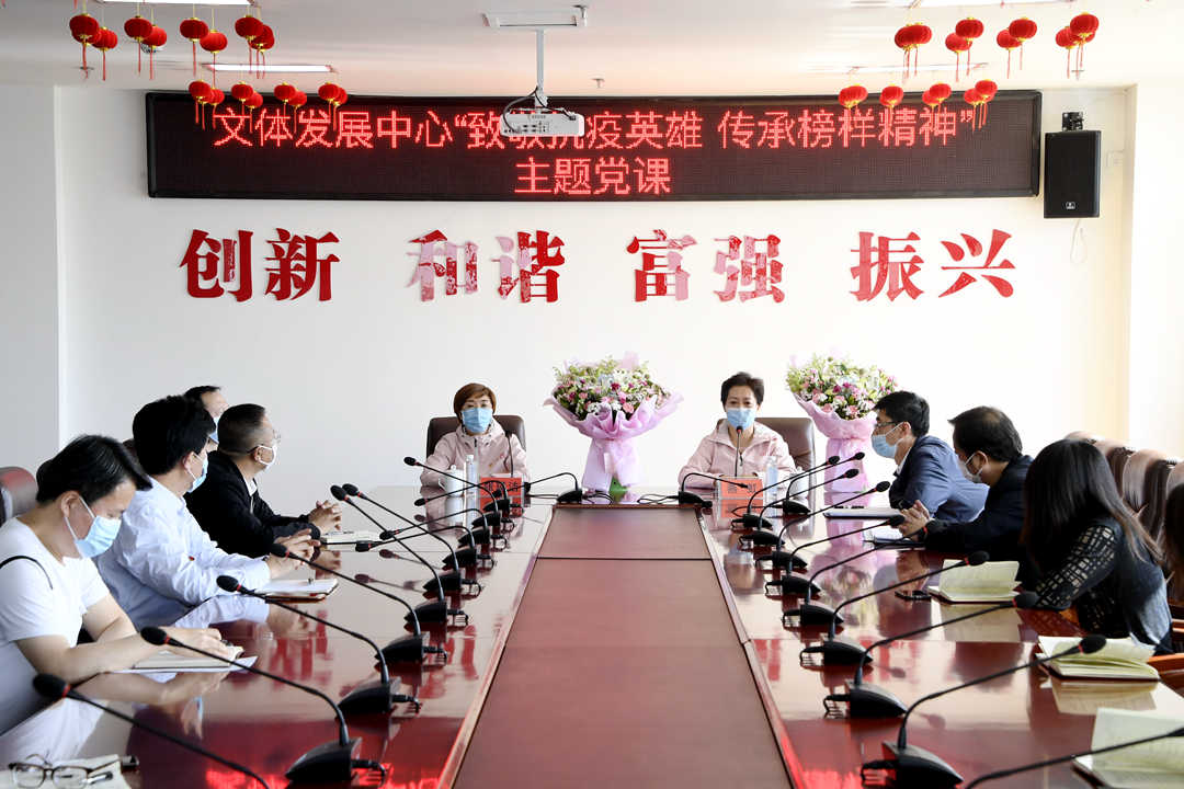 党课上,两名援鄂抗疫英雄用朴实的语言、感人的事迹和生动的讲述,回忆自己在抗疫前线经历的艰难时刻、与感人瞬间和平凡而伟大的战“疫”故事。她们的战疫故事,让文体发展中心全体党员干部为之动容、感人至深,听到动情之处大家时而掌声阵阵,时而潸然泪下。