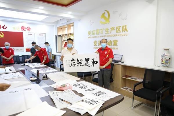 6月17日上午,兖矿集团鲍店煤矿矿老年书协暖心志愿者来到矿采掘楼生产区队党员活动室,开展“嘱安全、送祝福”活动,为井下区队干部职工赠送“安全书画”,营造安全氛围,助力安全生产月。