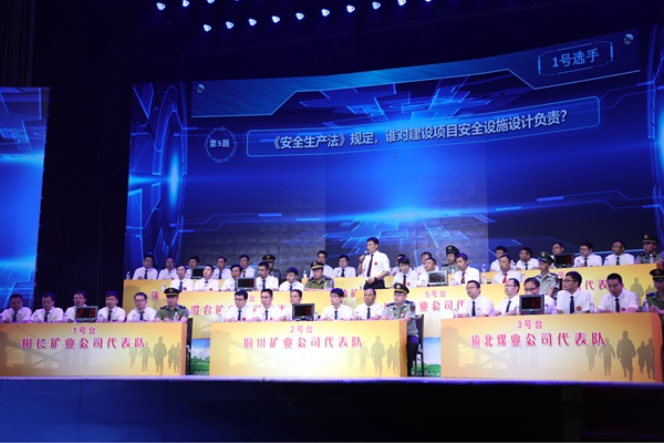 在上午举行的“学法规、抓落实、强管理”安全知识竞赛环节,8家矿业公司由“五职矿长”和救护队管理人员组成的共48名参赛选手,通过“精彩亮 相”、“风采依旧”“爱拼必赢”、“反败为胜”的两轮必答题、一轮抢答题和一轮风险挑战题的竞技比拼展开了激烈角逐。竞赛中,各参赛代表队参赛队员精神饱 满、声音洪亮,思维清晰,沉着应答,其中在必答环节,正常发挥,比分平稳;抢答环节,紧张激烈,拉开差距;挑战环节,顽强拼搏,奋力追击。整场比赛,既充 分展现了选手们对安全知识的熟练掌握和扎实功底,又彰显了良好的团队协作精神风貌。比赛期间为缓解紧张激烈的竞赛气氛还穿插了精彩的文艺节目,并进行了现 场观众互动答题,现场气氛热烈,掌声此起彼伏,观众喝彩声声。