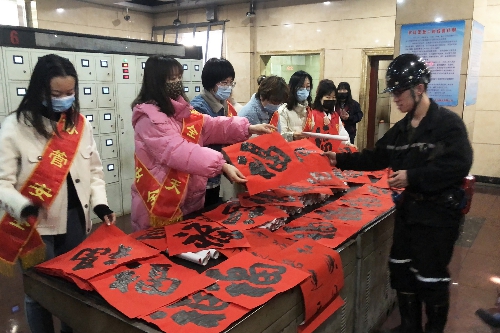 活动当日,该公司副井井口和生产队组人声鼎沸、喜气洋洋,该公司工会相关领导和女工们带着迎新春联和红彤彤的福字首先来到了运输队队部会议室。这天是星期五,正好是安全生产例会时间,在矿工们学习完安全操作规程和相关安全制度文件、接受安全教育之后,该公司工会的工作人员为在场的矿工送上了一副副春联和一个个代表着迎新接福的“福”字。与此同时,来自该公司的文艺爱好者还为矿工表演了独唱、舞蹈等文艺节目,为现场增添了喜庆的氛围,也为矿工带来了节日的欢乐。下午3点左右,正是井下矿工交接班下井升井的时间,该公司工会的女工们又来到井口,将一幅幅满载新春祝福的春联送给奋战在井下一线的矿工师傅们,在送去春联和福字的同时,还不忘提醒工人师傅,春节临近,一定要更加注意安全,切忌节日期间的麻皮大意思想,真正做到“安全伴我行,幸福矿区人”。在井口,该公司的文艺骨干同样为现场的工人师傅们献上了精心排练的精彩节目,嘹亮的歌声,优美的舞姿,引来现场一片欢声笑语和热烈的掌声,热闹的场面,洋溢着浓浓的年味。
