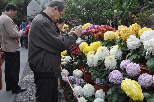 为庆祝十八届三中全会胜利闭幕,展示矿区精神文明建设成果,近日,山东丰源集团股份有限公司张集煤矿举办了首届菊花展。据了解,此次菊花展以倡导绿色环保为主题,特意突出了绿色、环保、经济的理念。图为职工及家属参观菊花展并竞相拍照。
