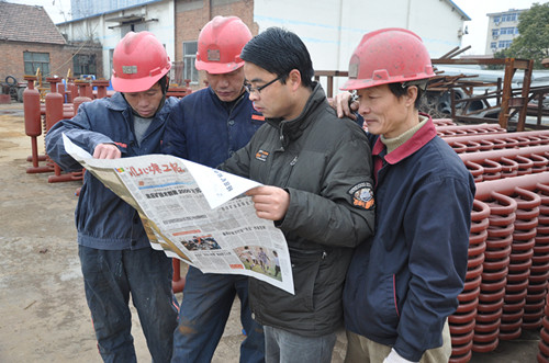 图为12月16日该集团工程建设公司状元劳模王发猛与工友一起分享刊发在《淮北矿工报》上讲述自己成长事迹的报告文学。