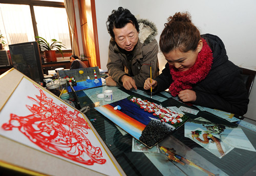 12月20日,安徽省淮北矿业集团朱庄煤矿物业科女工王梅(右)在老师指导下,用鹅卵石制作手工艺粘贴画。新年临近,该矿工会开展羽毛球赛、篮球赛、书画展、青年歌手大赛、手工艺作品展等一系列职工喜闻乐见的文体活动,增添了喜庆祥和的节日氛围。