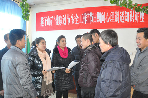 同煤集团燕子山矿举办节日期间心理调适知识讲座 来源:燕子山矿 作者:吕存 王锦龙 时间:2014-01-09 【字体:小 大】 在春节来临之际,为了让员工过一个幸福健康的春节,1月9日上午,同煤集团燕子山矿在综采二队会议室举办健康过节、安全工作节日期间心理调适知识讲座,来自各单位的职工代表参加了讲座。 此次讲座,通过心理讲师对全矿员工心理进行调适与疏导,减少节日期间的安全隐患、麻痹大意等不健康的安全隐患,并叮嘱广大员工在节日期间安全工作,健康过节。 智能标签: 同煤集团 燕子山矿 相关内容 分享到: 【打印正文】