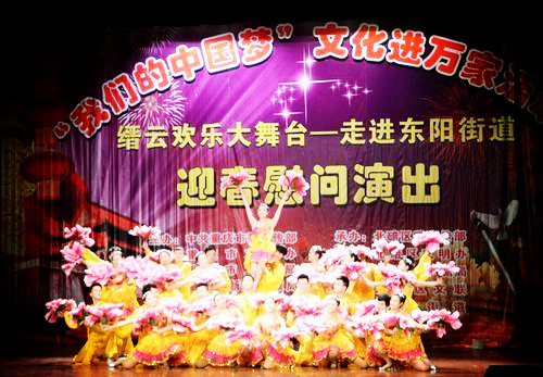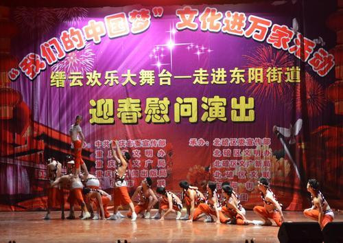为深入推进中国梦宣传教育活动,切实丰富广大人民群众的精神文化生活,由重庆市委宣传部、重庆市文明办、重庆市文化广电局、重庆市新闻出版局、重庆市文联等多部门联合开展我们的中国梦文化进万家活动,缙云欢乐大舞台走进东阳街道迎春慰问演出来到磨心坡矿,让矿区职工品尝到了丰盛、高雅的文化盛宴。