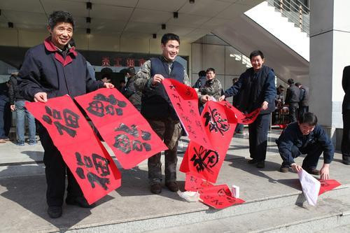 职工书画协会书法家们,冒着严寒来到矿区,有些书法家们虽都年事巳高,但他们不怕寒冷,挥毫泼墨,为矿区职工群众送去了暖暖的春意和新春的祝福。一副副大红春联增添了喜庆气氛,受到了职工群众的热烈欢迎。