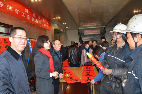 在成庄矿三号风井的交接班室里,矿领导、集团公司文联负责人和班前会的职工一起品读着春联:春满人间欢歌阵阵,福临门第喜气洋洋。带着工会的声声祝福,温暖涌动在职工的心中,每个人脸上洋溢起幸福的笑容。
