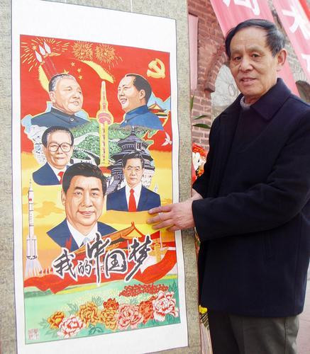 2014年1月27日,安徽淮北矿业集团临涣煤矿的剪纸艺人周学才在介绍新近完工的剪纸作品我的中国梦。