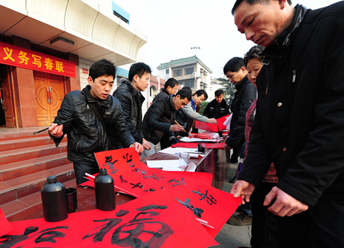 1月28日上午,安徽淮北矿业朱庄煤矿工会、团委在该矿工业广场开展义务写春联活动,来自生产一线单位的10多名书法爱好者不畏严寒,挥毫泼墨,把一副副带着暖意与墨香的春联送到矿工及家属手中,为节日的矿山增添了一份喜庆祥和的氛围。
