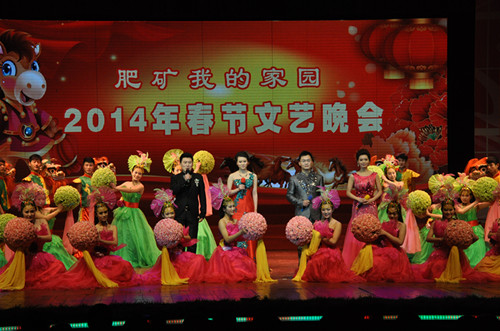 晚会在歌舞《狮舞新春》《开门大吉》中拉开序幕,由集团公司各单位职工自己创作表演的十余个精彩节目一一登台亮相,带给观众们一场精彩的视觉盛宴。相声小品《365-1=0》,将集团公司提出的安全论成败,效益论英雄的理念巧妙地融于剧情,通过家庭生活中戏剧化表演,解读煤矿安全的重要性。为表达对省外创业职工的感激之情,晚会选择了五首耳熟能详、脍炙人口的地方民歌联唱《歌声飘四方》,祝愿驻外建设者们在新的一年里,再有新作为,再创新佳绩。少儿舞蹈《梨园俏妞妞》,把舞蹈和国粹京剧有机结合在一起,从一个侧面寓意了集团公司管理过程中的传承与创新。2013年,集团公司安全生产持续稳定,鲁西南新区建设圆满收官,5F协同管理法持续深化,非煤产业取得新进展,步入转型发展快车道。音乐说唱《拍客大赛》,以时尚活泼的表演形式,盘点了集团公司2013年发展过程中的每一个精彩瞬间,展现了肥矿人奋发有为,成就肥矿梦的豪情。魔术《脱逃》,由矿区职工自己创作、自己动手制作道具,体现了节俭办晚会的宗旨,反映了矿区职工创新的激情和对技术精益求精的工作作风。排舞《矿山辣妈》,通过情景排舞串烧,反映矿区女职工工作一丝不苟,家庭生活打理得井井有条,工作生活相得益彰的能力。随着企业不断发展和职工收入不断提高,矿区私家车越来越多,小品《车位》通过风趣幽默的表演,倡导邻里之间和睦相处。远亲不如近邻,相处好了都快乐,情景歌舞《左邻右舍》体现了肥矿大家庭的和谐。寒雪梅中尽,春风柳上归,舞蹈《春色》寓意抖落冬日尘雪,迎接满园春色,演员美轮美奂的表演,博得观众阵阵掌声。没有比脚更长的路,没有比人更高的山。女声独唱《相信》唱出了矿区职工坚定信心,团结奋进,勇对煤炭市场寒潮,开创美好明天的信念和期待。放飞昂扬的信念,敞开坦荡的胸襟,像春笋攀升破土觅光,像春溪奔涌流淌化雪融冰,晚会在歌舞《春天,我们放飞心情》的优美旋律中落下帷幕。演出结束后,孙廷华等集团公司领导走上舞台与演职人员一一握手,祝贺演出成功,并合影留念。