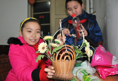 2月11日,安徽淮北矿业朱仙庄矿两名小朋友正在使用废弃物品制作花灯。随着节俭、环保理念深入人心,该矿工人村许多小朋友改变以往购买成品花灯的习惯,就地取材,利用身边废弃物品自己动手制作环保花灯,喜迎元宵佳节。