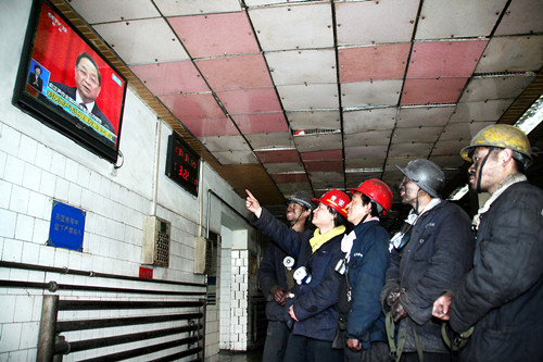 3月3日下午,皖北煤电集团百善矿员工在井口更衣室第一时间收看全国两会实况转播。