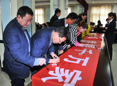 与会代表在印有安全工作人人抓、安全幸福千万家的安全横幅上郑重签名承诺