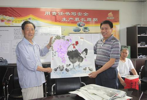 作为86岁高龄的该矿老年书会会长孙兆普,在安全生产月之初便组织40余名书会会员,早谋划、早着手、早行动,6月1日就推出了安全主题宣传橱窗,展出42名会员的56幅作品。随后深入井口进行慰问宣传,在井口展出安全书画作品43幅。6月中旬以来,先后组织开展了安全书画展览,我为安全来助阵主题书法笔会,为采掘一线职工送书画等活动,展出和送出书画作品近300幅,使职工在体验书画艺术愉悦感的同时,于潜移默化中增强了安全意识。同时,该书会还积极参加集团公司泰和广场和矿安全宣传咨询日活动,为今年的安全生产月书写了浓墨重彩的一笔。图为老年书会会长孙兆普(左)带领书会会员送书画进区队。