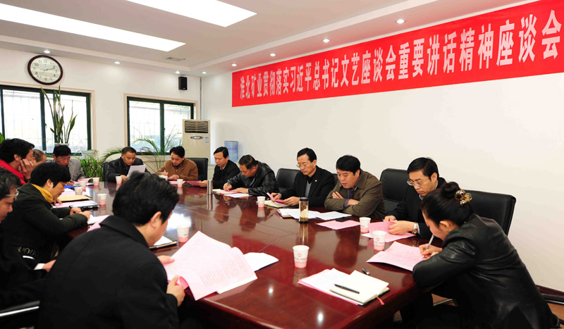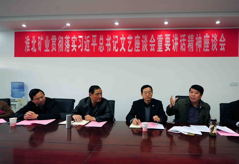 座谈会由公司工会文体部部长(淮北矿区书法家协会主席)盛军主持,与会人员为矿区文艺骨干及各文艺协会负责人。盛军首先传达“中国煤矿文联(基金会)学习贯彻落实习近平总书记在文艺工作座谈会上重要讲话精神座谈会在京举行”的相关情况,然后带领与会人员认真学习了习近平总书记《在文艺工作座谈会上的讲话》,客观地分析和评价了淮北矿区文艺创作现状和所取得的成果。他表示,总书记的讲话指明了当前中国文艺发展的方向,是继毛泽东同志《在延安文艺座谈会上的讲话》之后的又一篇文艺工作重要文献,充分体现了党中央对文艺工作的高度重视和对广大文艺工作者的殷切期望,作为矿区文艺工作者要坚持为人民服务、为社会主义服务的根本方向,把社会主义核心价值观生动活泼、活灵活现地体现在煤矿文艺创作之中;要以满足职工群众精神文化需求为出发点和落脚点,以丰富多彩、昂扬向上的文化娱乐活动为载体,为淮北矿业应对异常严峻经营形势和安全生产做出积极贡献。