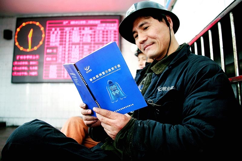 近日,在皖北煤电集团百善矿井口候罐室内,该矿员工及时阅读学习随身携带的《事故案例警示教育手册》。今年,为确保新常态下企业安全生产,长治久安,皖北煤电集团围绕矿井顶板、机电等六大类内容,自主编印《事故案例警示教育手册》。