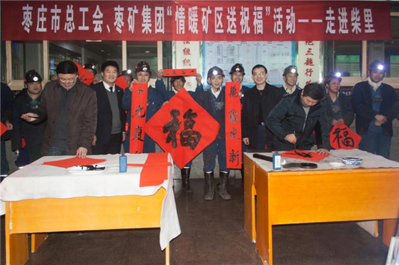 随后书法家代表还走进该矿南副井口和采掘区队,为上下井的职工现场书写春联,将撰写好的春联赠送给采掘一线的职工,真正做到了“心系一线为职工,情暖矿区送祝福”的活动宗旨。