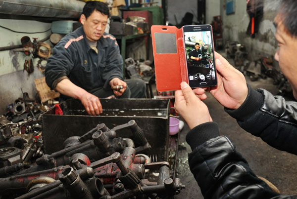 2月27日,安徽淮北矿业集团朱仙庄矿青工王大军工正在用手机拍下工友李德勇修旧利废的工作瞬间。该矿团委开展“寻找最美节约人手机随手拍”活动,鼓励团员青年用手机拍摄职工立足岗位节支降耗、创新创效的感人瞬间,用身边的人和身边的事弘扬节俭好风尚,激发团员青年为企业降本增效、转型升级做贡献。