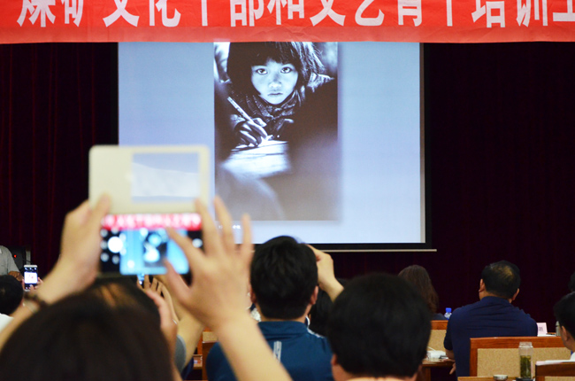 著名摄影家、中国文艺志愿者协会副主席解海龙与学员分享了他用镜头记录贫困家庭、偏远山村教育状况的经历。他分析了摄影“真、新、美、深、难”的五个阶段,介绍了摄影艺术与宣传公益事业、与推动希望工程发展结合的案例,详细地讲述了改变数百万儿童命运的一张张照片背后的感人故事。