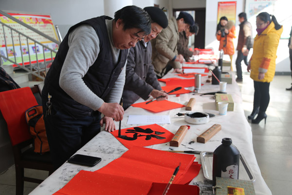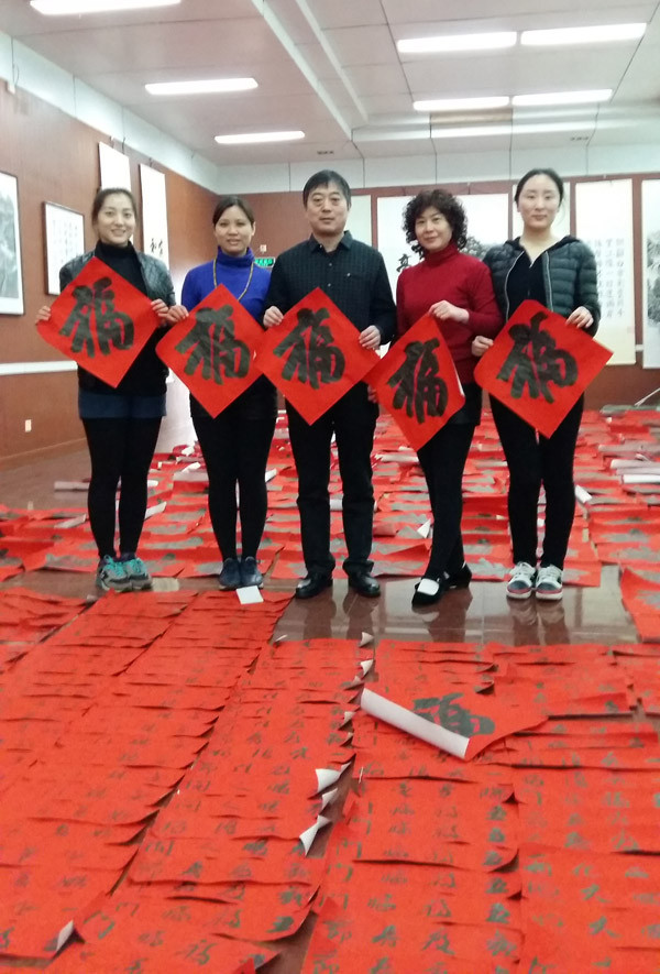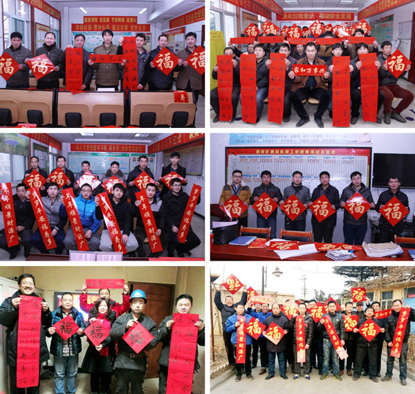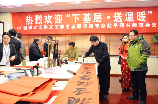中国煤矿书法家协会积极响应中国书协关于2016年元旦春节期间开展“万名书法家送万‘福’进万家”公益活动的通知精神,认真组织煤炭系统各企业书法组织开展送万‘福’进万家活动。1月31日,由中国煤矿文联主办,中煤平朔集团公司承办的“走基层·送温暖”中国煤矿文联文艺志愿服务走进平朔活动在平朔矿区举行。活动现场气氛热烈,艺术家们挥毫泼墨,为平朔矿区职工写“福”字、写春联,边创作书画作品边和平朔矿区的书画爱好者交流创作经验,笔会交流活动共书写“福”字200多个,春联60多套,创作书法作品50多件、美术作品10多件。艺术家们用饱蘸喜气墨汁的画笔创作出一件件饱含诚意的书画作品,为平朔矿区职工红红火火的生活送上美好的祝愿。