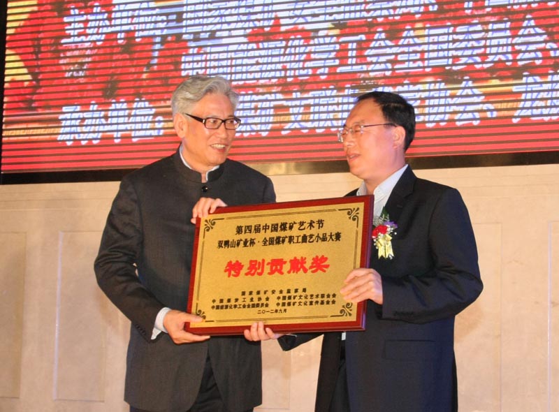 中国煤矿文联主席梁嘉琨向双鸭山矿业集团颁发特别贡献奖,双鸭山矿业集团纪委书记、工会主席林森领奖