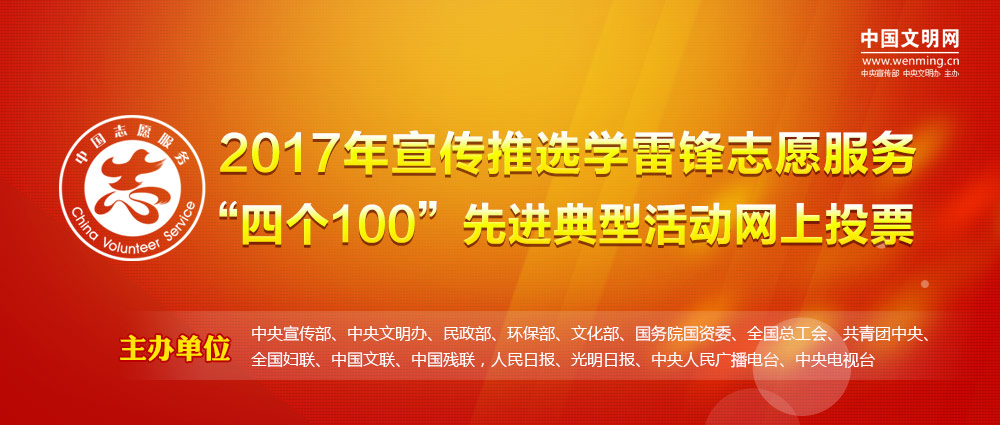 新华社北京12月27日电 2017年宣传推选学雷锋志愿服务“四个100”先进典型活动由中宣部、中央文明办等部门组织开展,目前已经进入事迹展示和群众投票阶段,广大群众可以通过中国文明网、人民网、新华网、光明网、央视网和“文明中国”手机客户端,查看先进典型的事迹展示,感受志愿者的崇高精神,并为心目中的最美志愿者、最佳志愿服务组织、最佳志愿服务项目和最美志愿服务社区投上宝贵的一票。