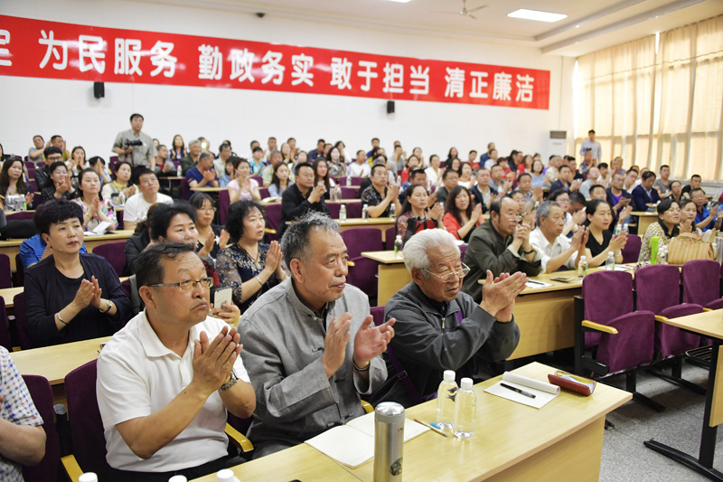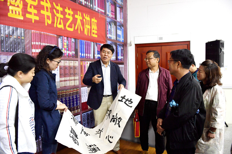 党校的第一教室坐满了学员,大约有100多人,他们是来自同煤集团下属各二级单位文委的负责人、书画创作骨干和文艺爱好者。盛军以书法艺术欣赏为切入点,从书法艺术史论到历代书法创作特点,从书法篆刻与古文字、历史事件的关系到书法作品参展和创作要点等,介绍了大量典故和人物,深入浅出、生动有趣地讲述了书法和篆刻艺术,特别是在他古声古韵地背诵和解读《兰亭序》《心经》等经典名段时,教室里响起的掌声和赞叹声尤为热烈。