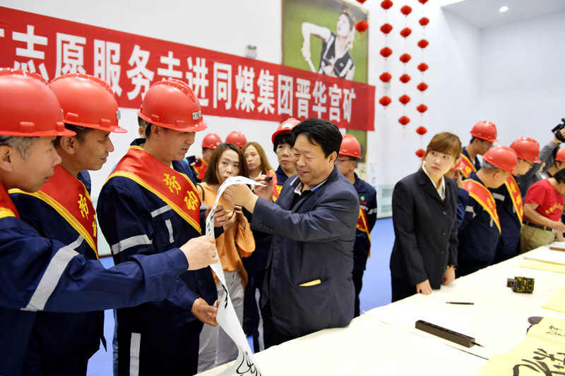 志愿服务期间,盛军代表中国煤矿文联向塔山煤矿和晋华宫矿分别赠送了“社会主义核心价值观”书法作品。