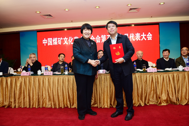 庞崇娅为新当选的中国煤矿文联秘书长盛军颁发证书