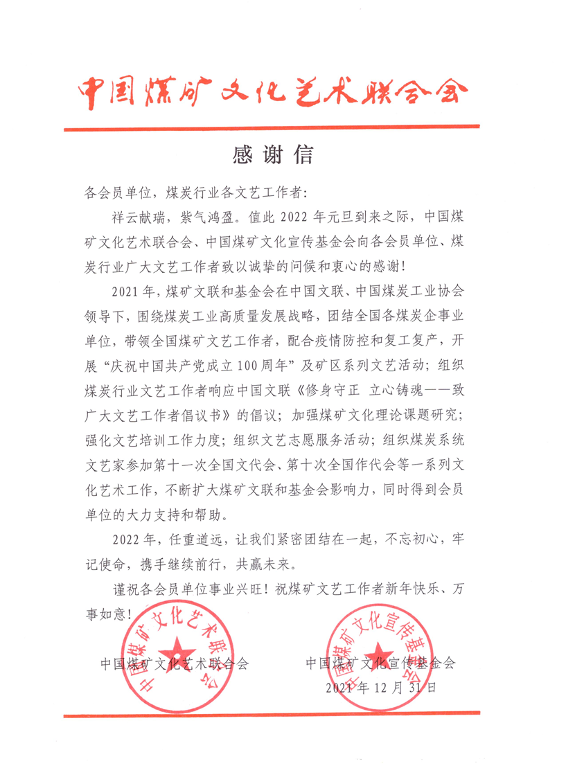 中国煤矿文化艺术联合会、中国煤矿文化宣传基金会向各会员单位、煤炭行业广大文艺工作者致以诚挚的问候和衷心的感谢!