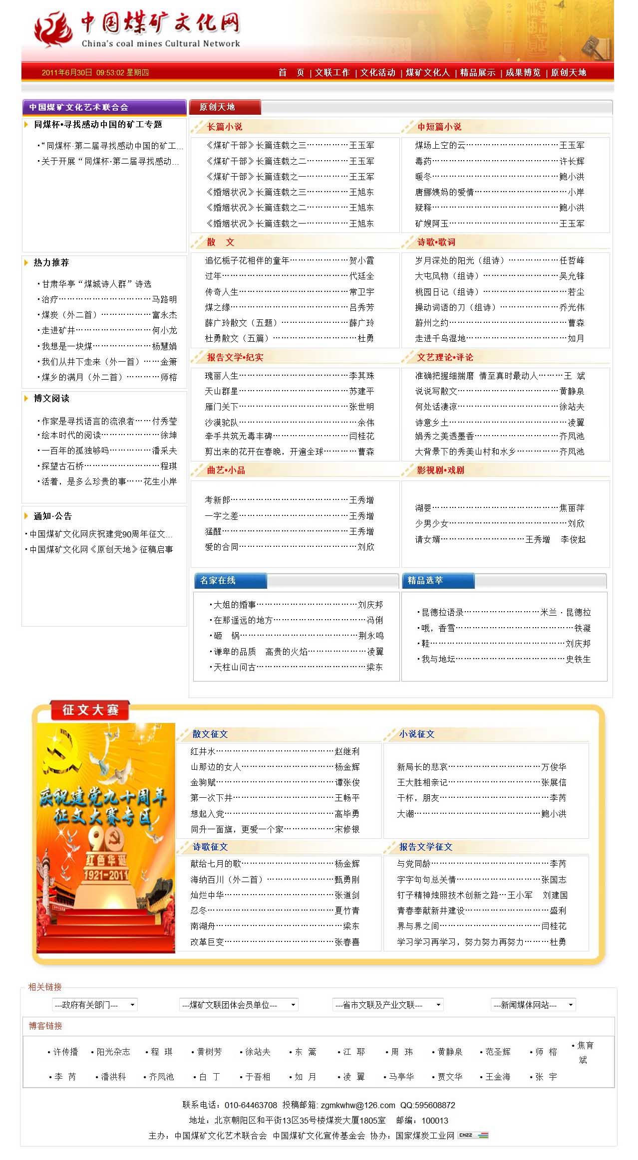 7月1日,中国煤矿文化网《原创天地》在煤矿文化网链接成功,这标志着《原创天地》已经正式开办。《原创天地》是依托中国煤矿文化网络平台,展示我国当代煤矿文学艺术创作实力,检阅当代煤矿作家、艺术家阵容的又一块园地,是煤矿广大文艺创作爱好者放飞梦想的又一片天空。《原创天地》开设有小说、诗歌、散文、纪实文学、文艺评论、影视戏剧文学、曲艺、小品等栏目,诚邀广大作者踊跃投稿。