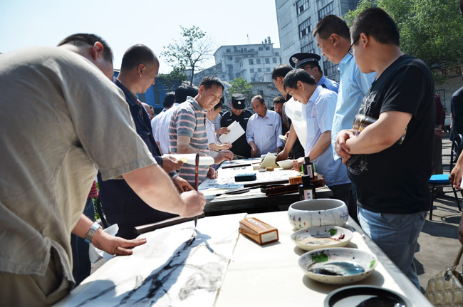 上午,中国煤矿文联副主席兼秘书长张强带领文艺志愿者们和阳煤集团工会主席张建起、副主席孟德玉等同志一同来到阳煤集团一矿北丈八井口开展“送文化、进阳煤”文艺志愿服务活动。表演艺术家们为煤矿工人演出了单口相声、雷琴独奏等节目,演出现场聚满了阳煤集团一矿的职工:有刚刚升井的,有正准备下井的,还有闻讯赶来的轮休职工,大家笑声阵阵,掌声不断,现场气氛十分热烈。书画家们头顶炎炎烈日为职工现场创作书画作品,书画家们身边围满了阳煤集团一矿的书画爱好者,现场一共赠出近百幅书画作品。