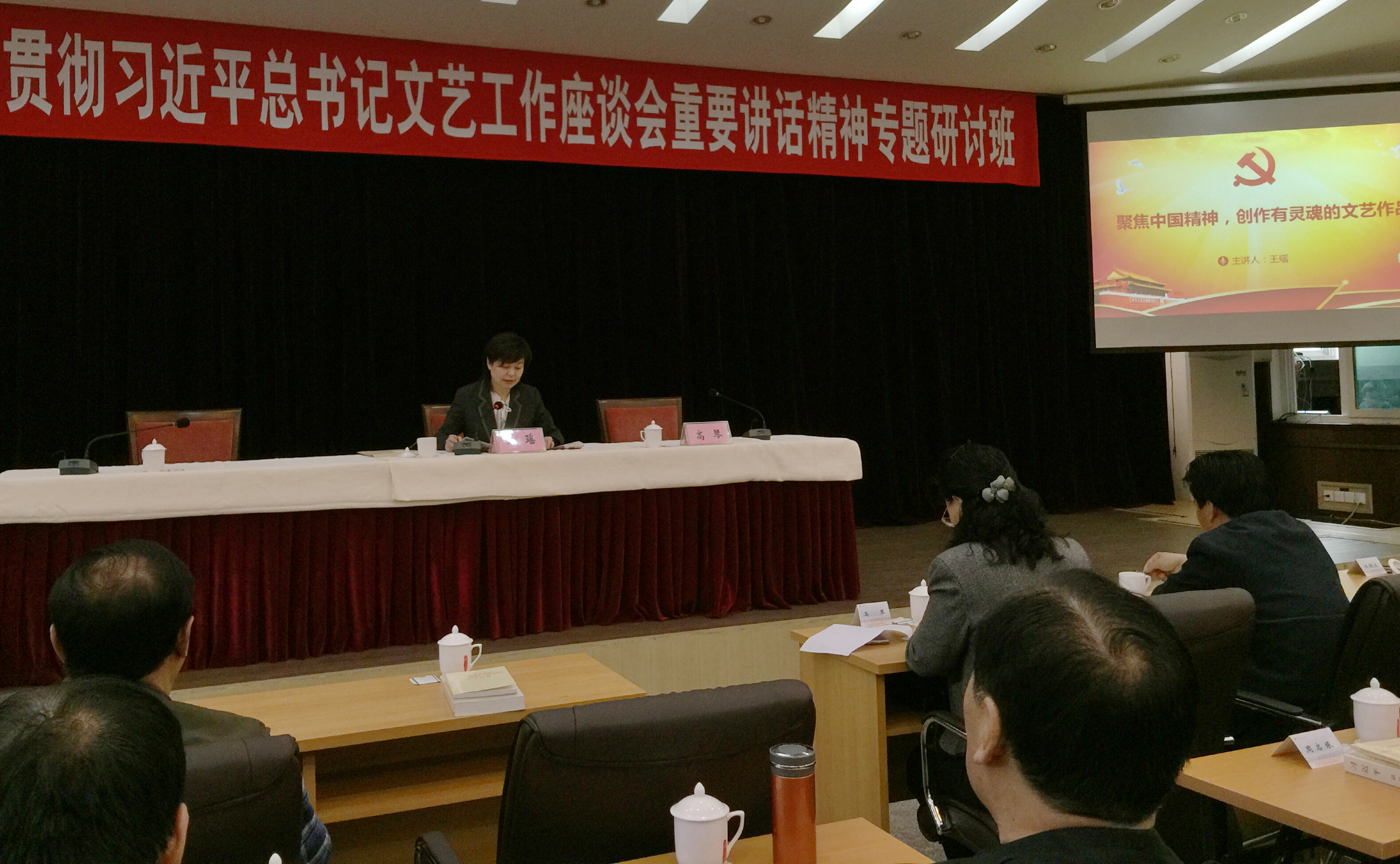 王瑶为学员们作题为《聚焦中国精神,创作有灵魂的文艺作品》的讲座。王瑶指出,文艺之责是时代前进的号角,文艺之本是创作、生产优秀作品,文艺之根是深入人民、服务人民,文艺之魂是中国精神。王瑶用国内外不同门类艺术家的鲜活事例强调,学习总书记的讲话精神,文艺工作者要增强使命感、责任感和紧迫感;要坚持以人民为中心的创作导向;要深入生活,克服浮躁,潜心创作;要把创新精神贯穿在文艺创作的全过程;要大力弘扬中国精神,讲好中国故事。