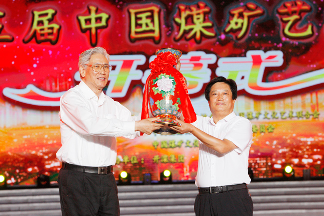 梁嘉琨(左)代表艺术节组委会向开滦集团颁发第五届中国煤矿艺术节特别贡献奖