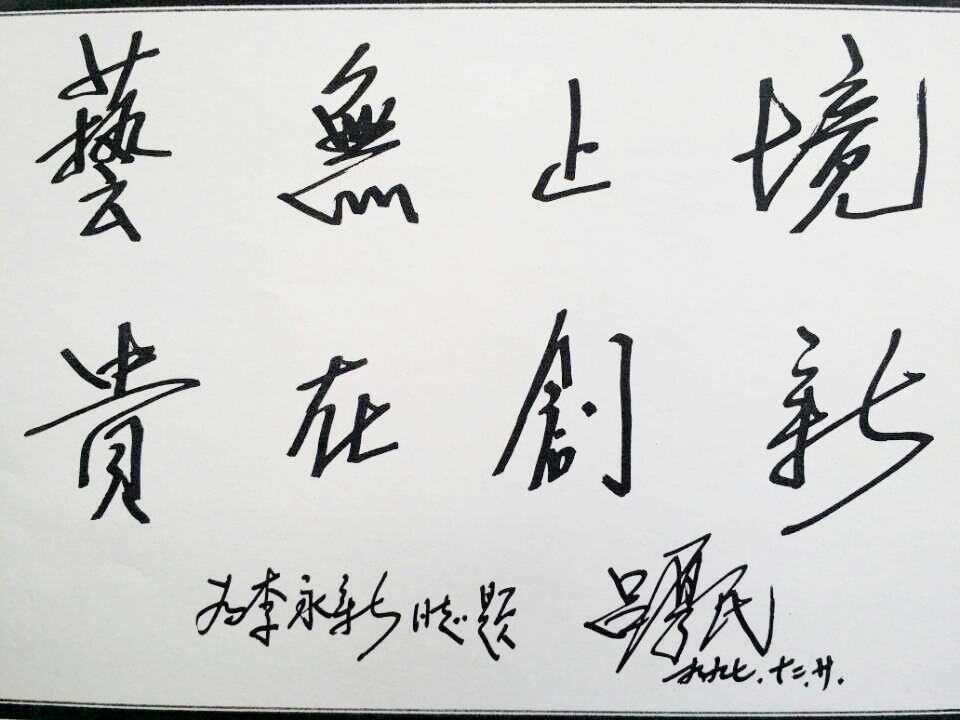 他问我在山西什么煤矿、从事摄影多长时间了、对摄影有何见解等等,我都一一做了回答。当得知我是摄影专业毕业、已有不少作品得到认可,还在煤矿基层单位带领一批摄影爱好者学摄影、办展览、帮单位出画册、积极参加和组织各类摄影赛事等等,吕老连连点头称赞做的好。不知不觉已近一个小时的时间了,怕影响吕老的工作,我主动起身作别,并提出想要一个吕老的签名,没想到,吕老爽快地答应了。他说:“就不用在本本上写了,本本上有线条,写出来影响效果”,于是,他拿出桌子的一张白纸,写下了“艺无止境,贵在创新”。这八个字激励着我在摄影创作上拼搏向前!