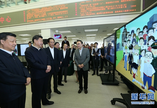 2月19日,中共中央总书记、国家主席、中央军委主席习近平在北京主持召开党的新闻舆论工作座谈会,并到中央新闻单位调研。这是习近平在新华社观看新闻信息产品展示。新华社记者 兰红光 摄