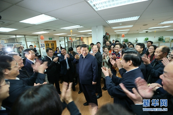 19日上午,习近平首先来到人民日报社调研。编辑楼内,一块块展板、一幅幅照片展示了党中央对人民日报的关怀,反映了人民日报社走过的不平凡历程。习近平一边观看,一边听汇报,他充分肯定人民日报创刊68年来为党和人民事业作出的重要贡献。在总编室夜班平台,习近平看编辑排版,同大家亲切交流,勉励他们不忘初衷、坚定信念,把报纸办得更好,为全国人民提供更多更好的精神食粮。习近平走进新媒体中心,在大屏幕前听取微博、微信、客户端工作介绍,并在一台电脑前坐下,通过新媒体平台发送语音信息,向全国人民致以元宵节的问候和祝福。