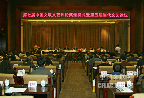 11月1日至2日,由中国文联主办、中国文联理论研究室和湖南省文联承办的第七届中国文联文艺评论奖颁奖式暨第五届当代文艺论坛在湖南长沙举办。中国文联党组书记、副主席胡振民发来贺信。中国文联党组成员、书记处书记夏潮,湖南省政协副主席、省文联主席谭仲池到会讲话。中国舞协分党组书记、驻会副主席冯双白,中国摄协分党组书记、驻会副主席李前光,中国文联理论研究室主任董耀鹏,本报社长向云驹,湖南省委宣传部副部长张志初,湖南省文联党组书记、副主席罗成琰和中国文联有关部门、湖南省文联相关领导以及中国文联各文艺家协会、各省区市文联分管理论评论工作的领导和理论评论工作部门代表,文艺理论评论家代表,获奖作者代表共约130人出席颁奖式。颁奖式由董耀鹏主持。